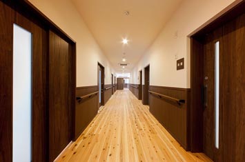 | 徳島杉を使用した木造在来工法・耐火建築。林野庁助成を受給。外装は地元の藍染技術による。太陽光発電設置。 |
