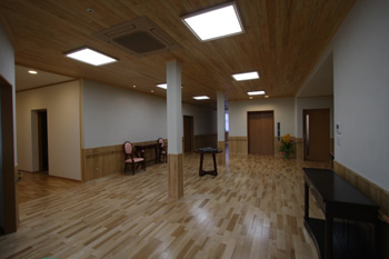 木造在来工法の耐火建築。 工期短縮、コスト削減、利用者にも介護職員にも優しい木造。 (社)日本木造住宅産業協会の認定工法による。 |
